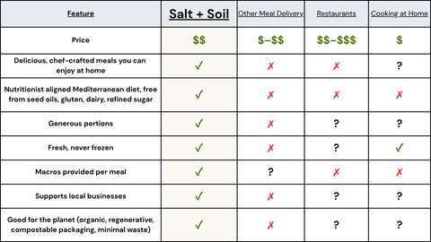 At Salt + Soil, we stand behind every meal we prepare. We guarantee you’ll love your experience—nourishing food, seamless service, and the peace of mind that comes with eating well. If for any reason you don’t love it, simply email us and we’ll do everything we can to make it right. And if we’re not able to leave you 100% satisfied, we’ll gladly offer you a full refund.